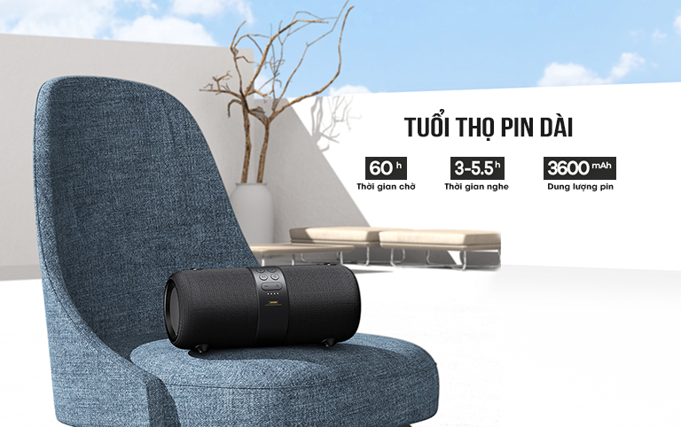 Loa được trang bị viên pin chất lượng cao có dung lượng lên đến 3600mAh giúp người dùng thoải mái nghe nhạc trong 3-5.5 tiếng đồng hồ. Thời gian chờ của loa có thể lên đến 60h và chỉ cần đúng 4 tiếng là đã sạc đầy pin cho loa qua cổng Type C tích hợp để tiếp tục sử dụng.