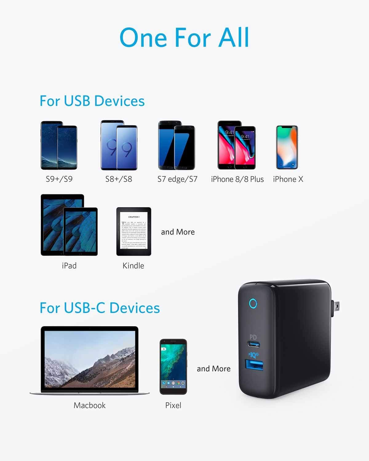 Quên về việc dùng nhiều bộ sạc khác nhau ở khắp mọi nơi bạn đi. Với một cổng USB-C Power Delivery chuyên dụng và một cổng được trang bị công nghệ PowerIQ 2.0 nổi tiếng thế giới của Anker, bạn có thể sạc gần như mọi thiết bị bạn sở hữu — tất cả từ một bộ sạc duy nhất.